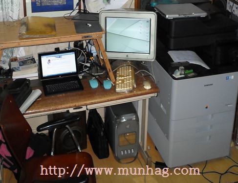 -왼 쪽 중앙의 검정색 : 태블릿 PC, 오른쪽-삼성 칼라 복사기 X4220RX, 중앙 : 매킨토시 파워맥 G4, 위의 모니터, 키보드, 마우스, 아래 본체-