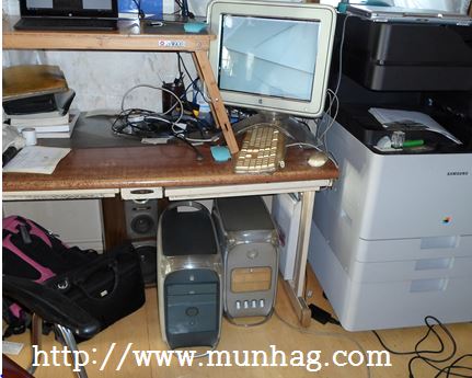 -아래 왼 쪽 컴퓨터 본체가 기존의 것(750M 메모리), 오른 쪽 것이 12만원 주고 새로 구입한 맥(1G 메모리). 왼 쪽 것을 살리려고 해 보았지만 이제 완전히 죽어 버렸다. 그렇다고 사용해도 오른 쪽 것에 비하면 느려서 별로 의미가 없었지만...-