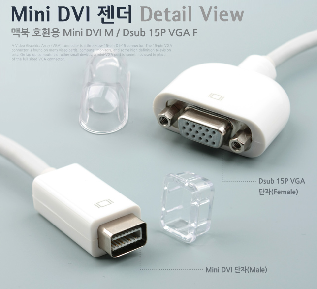 아답터를 두 개씩이나 구입했는데 하나는 DVI 모니터와 맥용 미니 mini DVI에서 DVI 와 연결되고 다른 하나는 mini VGA와 연결되는 부품이었다. 그런데 구입한 것이 신형 맥북에어, 맥북프로 와 연결되는 아주 작은 단자를 갖고 있었으므로 내 것에는 맞지를 않았던 것이다.