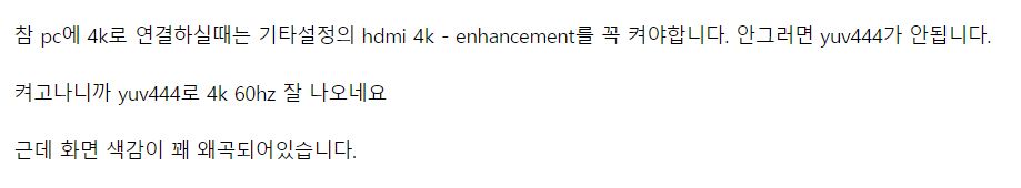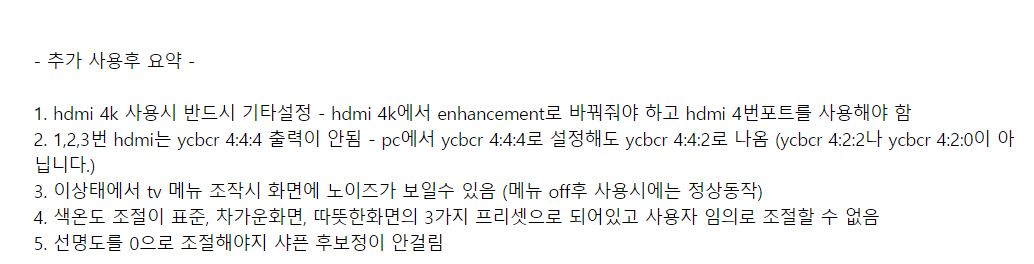 이렇게 시작된 의문점을 다시금 되새겨 볼 수 있는 기회를 맞이한다. 어제 퇴계원 오남로까지 직접 찾아가서 1톤 화물차 조수석에 길게 걸쳐 놓고 신주단지 모시듯이 갖고온 4K TV을 테스트한 결과 일단은 성공한 셈이었다. 원하는 결과만큼 화질이 좋지 않은 듯했지만 기존에 TV처럼 글씨가 깨지게 나타나지 않았다. 가장 문제과 되는 TV와 모니터의 차이점이 바로 그것이니까. 별 다른 문제가 없어보였지만 확실히 LG 4K 모니터를 사용할 때와는 비교도 되지 않을 정도로 선명도가 흐렸다.