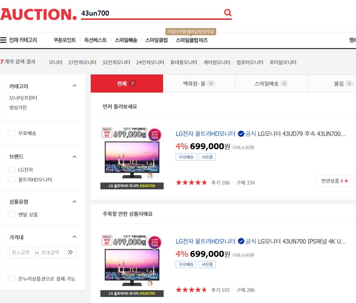 3. 그래서 후회감이 들었지만 어쩔 수 없는 노릇이었다. 때마침, 다시 43인치의 모니터가 번개장터에 떳다. 그래서 선뜻 구매한 것이다. 하지만 가격이 문제였다. 50만원? 하지만 옥션에서 새 제품을 알아 보니 699,000원이다.