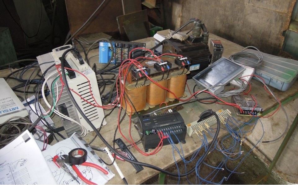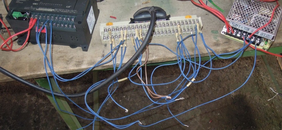 라는 LS 서보모터 드라이버와 모타를 작동시키기 위해서 테스트를 해보지만 계속 실패를 합니다. 중고 기계에서 뜯어 낸 뒤에 아래처럼 전기를 배선해 놓고 작동 테스트를 하기 위해 조립을 임시로 해 놓은 상태입니다.
