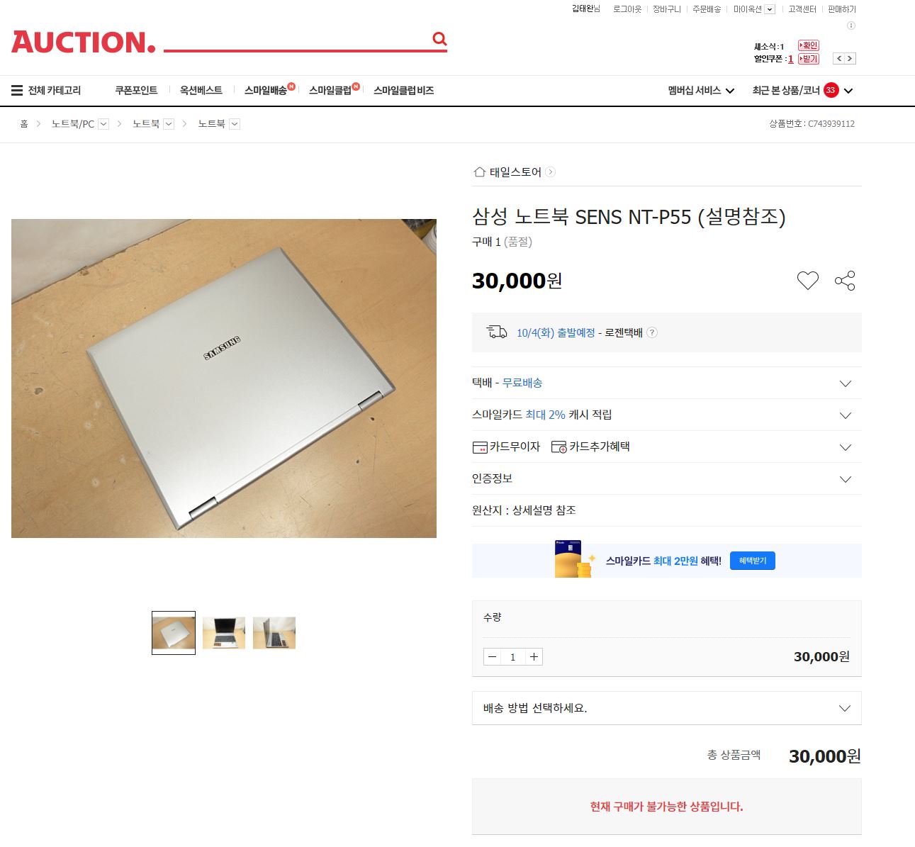 28. 이 사실을 알고 난 뒤, 당장 옥션과 번개장터에서 검색을 했다. 그리고 삼성 센스 P55 노트북 컴퓨터를 옥션에서 중고로 다시 구입하게 된다. 이 제품 외에 두 개의 다른 제품이 올라와 았었는데 모두 120,000원과 그 이상의 가격이었다. 그런데 30,000원이라니...