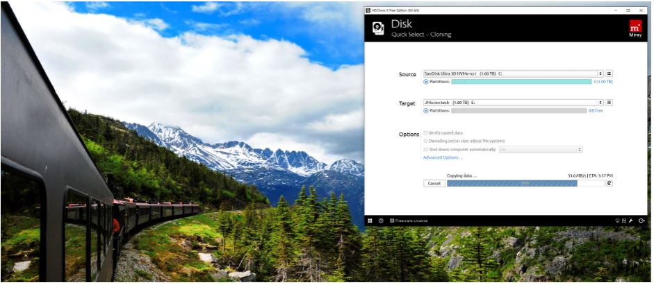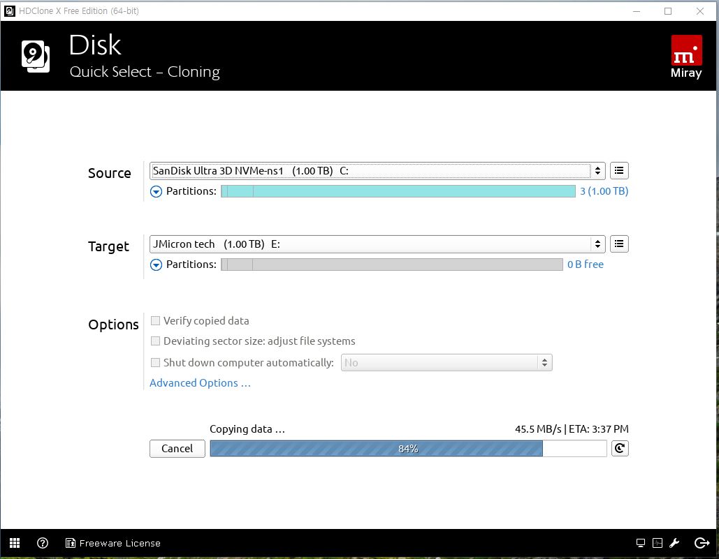 Target 에는 복사할 SSD 를 외장 하드에 담아서 USB 포트로 연결한 상태였다. 두 SSD 모두 1TB 의 용량이었고...