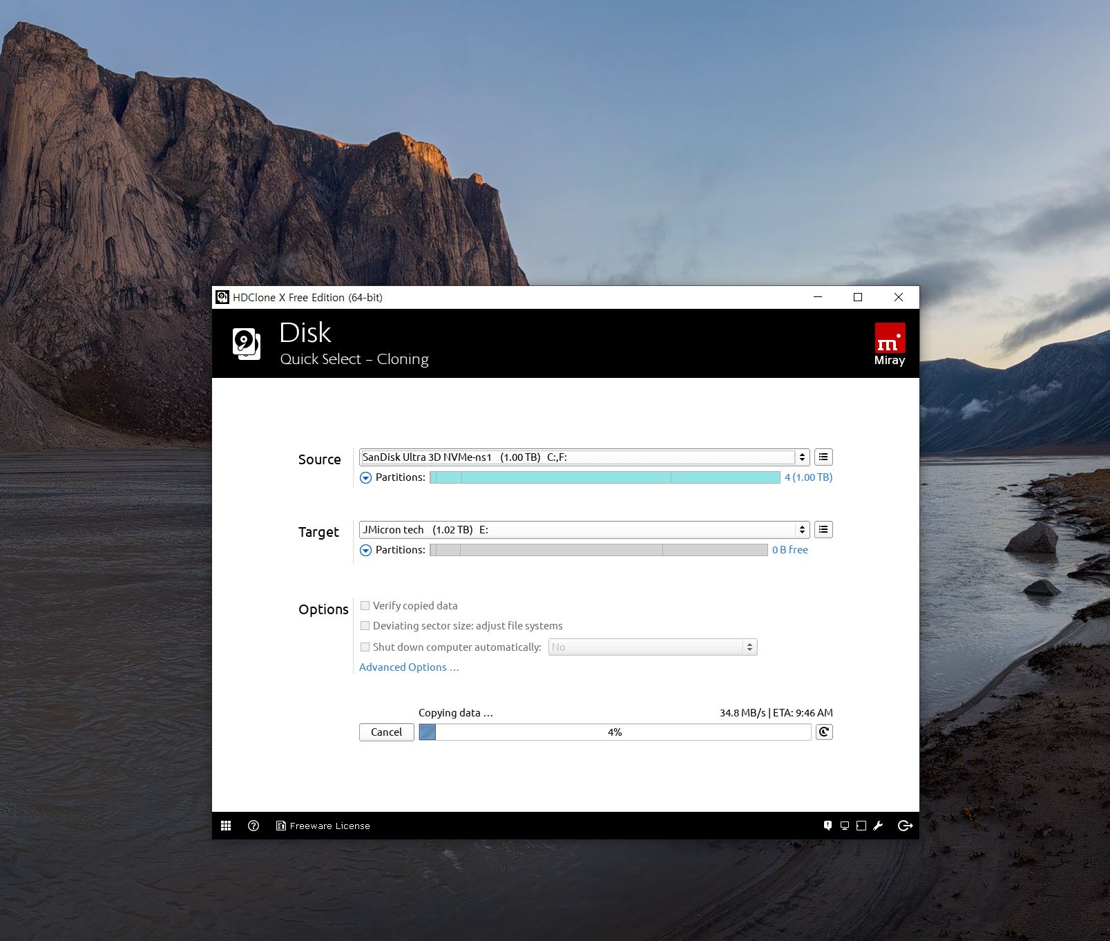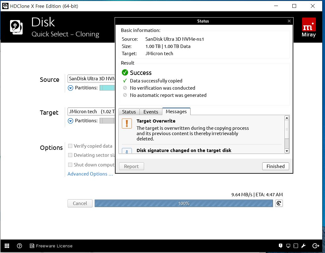 16. 3일 전부터 HDClone 프로그램으로 집에 사용하던 노트북을 복사하게 된다. 컴퓨터를 켜 놓고 집을 비워야만 했고 낮에는 다른 일을 했으므로 저녁에 퇴근하여 컴퓨터를 확인했는데 100%가 작업하지 않았다. 잠자기가 실행 되었던 모양이다. 그렇게 3일 동안 컴퓨터를 켜 놓았지만 오늘 아침에서야 어제 저녁에 밤 1시에 계속 컴퓨터를 작업하다가 그만 잠 자리에 들고 말았었는데 아침에 확인했더니 복사가 모두 끝났다고 메시지가 떠 있었다.