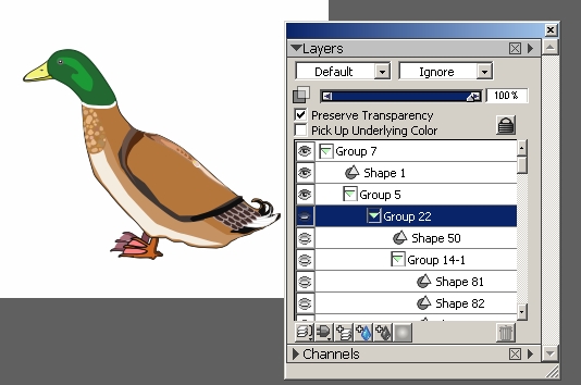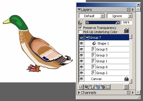 1. 페인트 샵보다 선명한 그림. 즉, 비트맨 방식이 아닌 백터 방식의 레이어로 구성된 그림을 그릴 수 있다. 아래 그림처럼 이 그림은 'Group 7' 이라는 전체 구룹으로 구성되어 있다. 아래처럼 구룹속에 또 다른 구룹들을 감추고 있는데...