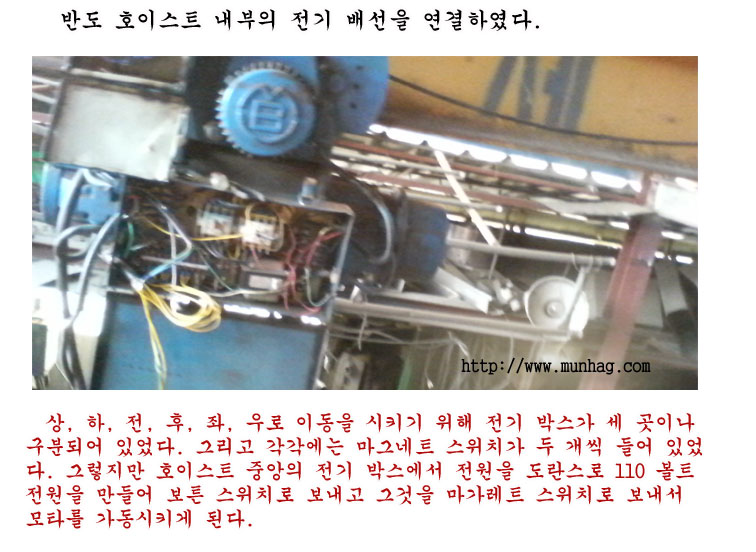 상, 하, 전, 후, 좌, 우로 이동을 시키기 위해 전기 박스가 세 곳이나 구분되어 있었다. 그리고 각각에는 마그네트 스위치가 두 개씩 들어 있었다. 그렇지만 호이스트 중앙의 전기 박스에서 전원을 도란스로 110 볼트 전원을 만들어 보튼 스위치로 보내고 그것을 마가레트 스위치로 보내서 모타를 가동시키게 된다.