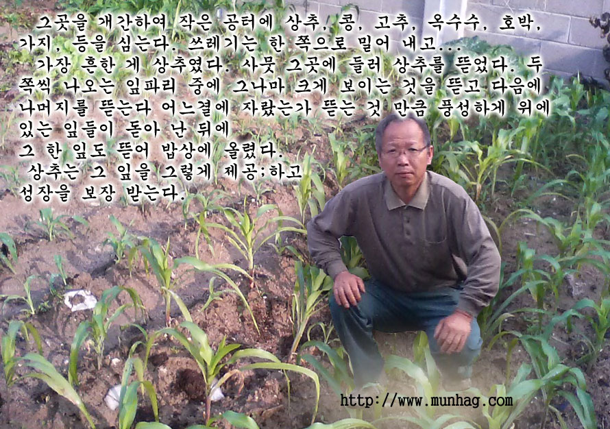 그곳을 개간하여 작은 공터에 상추, 콩, 고추, 옥수수, 호박, 가지, 등을 심는다. 쓰레기는 한 쪽으로 밀어 내고...
