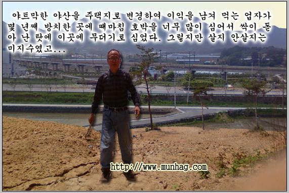 지금도 처음 이곳으로 이사를 왔을 때처럼 호박을 깨트려 놓은 곳에서 싹이 터와서 처분을 하지 못하다가 200여미터 떨어지 야산의 개발지와 집 주위에 모종을 하였다.