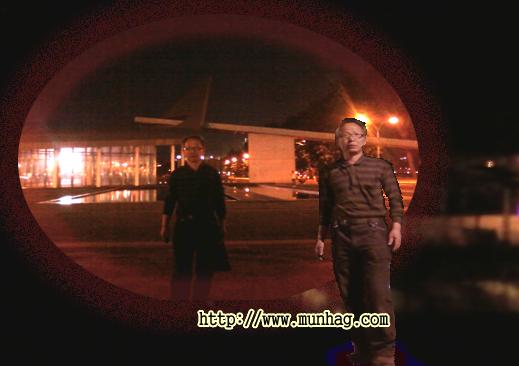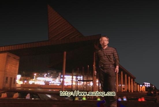 -대구 출장을 갔을 때 영남 대학교 정문앞의 문화적인 시설물. 바닥에 물을 담아 놓은 직사각형 물통이 길에 늘어트려져 있었다. 아마도 분수대가 있을 법하건만 물은 뿜어져 나오지 않았다. 짙은 어둠으로 잠겨 있었지만 물빛에 반사되는 불빛을 따라 가다보니 휘황찬란한 불빛이 진열대처럼 비쳐대는 둠형식의 건물이 나타났고... 그러나 이 건물도 상징적인 듯 시설물은 없는 연못의 중앙에 세워진 공간물일 뿐이었다.-