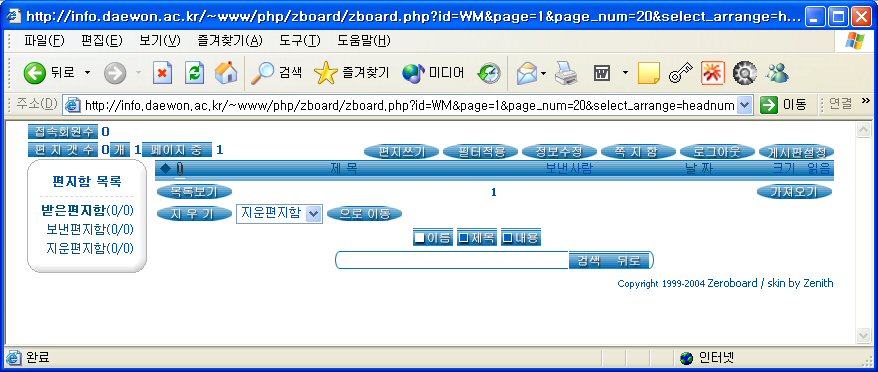 7. 제로보드의 사용자로 로그인을 한 후 웹메일 스킨(zenith)을 적용한 게시판을 띄운 후, (정보수정) 버튼을