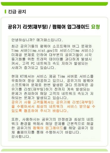 KT 메가패스를 홈페이지에 들어가서 공지사항을 들여다 보다가 위와 같은 내용을 확인하고 부랴부랴 공유기를 껐다가 겼더니 속도가 빨라졌다.