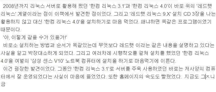 이 책에서 나오는 여러가지 리눅스에 관한 설명을 대입하는데 '한컴 리눅스 4.0'으로 설치해 놓은 상태에서도 똑같이 실행이 되었던 것이다. 그렇지 않고 '레드햇 9.X' 로 CD로 설치하였다면 많은 시행착오를 겪다가 포기하였을 것이다. 왜냐하면 그만큼 리눅스에 관계되는 것을 적동한다는 사실은 하늘에 별을 따듯이 힘들고 불가능할 정도로 어려웠으므로 많은 시간을 항애하다가 결국에는 너무 힘들어서 중도탈락할 수도 있었다. 왜냐하면 너무도 시간이 부족했으므로... 달리 포기하는 것이 아니고 시간이 너무 잡아 먹을 수 밖에 없었고 '한컴 리눅스 4.0'으로 설치하던 몇 년 전에도 여러 차례 그런 경험을 갖고 있었다. 그래서 '한컴 리눅스 4.0'으로 설치하다가 포기하고 '한컴 리눅스 3.1'로 서버를 운영하였던 것도 그런 이유 때문이었다. 그렇지만 '한컴 리눅스 3.1'은 커널의 버전이 낮아서 '제로보드 XE'가 설치되지 않았었다.
