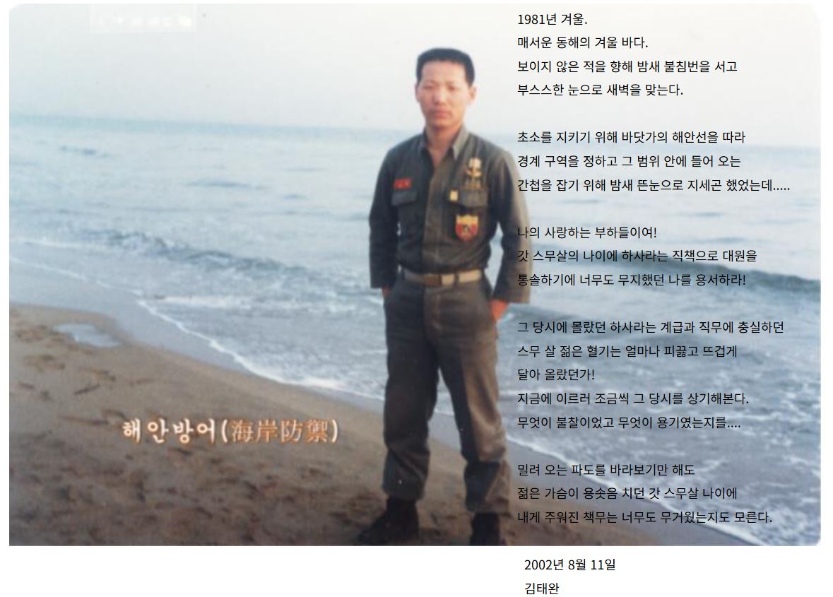그렇게 불현듯 일주일 동안 '해안방어'에 관한 내용을 찾아 C.D 디스크, 외장형 하드드라이버, 홈페이지로 사용되었던 서버 노트북 컴퓨터, 그 밖의 각종 저장 메체를 샅샅히 뒤져 보았고 결국 모든 자료들에서 마침내 꿈에 그리던 그 예전에 적어 놓았던 글을 어제 당당하게 찾아 내게 도고 그것들을 부랴부랴 지금의 홈페이지에 옮겨 놓게 된다. 그리고 그제서야 위안을 받고 안심을 하였다.